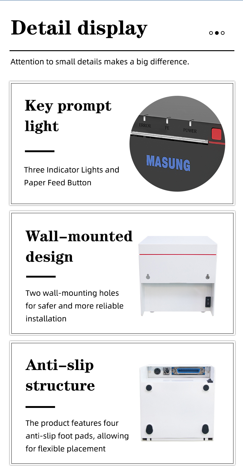 Maximize your space without compromising on capability. This 80 mm portable thermal printer boasts a compact and lightweight design, complemented by multiple installation options including wall-mounting and adjustable angles. Its attractive LED indicators provide clear status updates at a glance. The highly adaptable 80 mm thermal printer supports interface diversification with RS-232, USB, Parallel, and Ethernet connections, allowing for seamless integration into both new and existing point-of-sale systems.