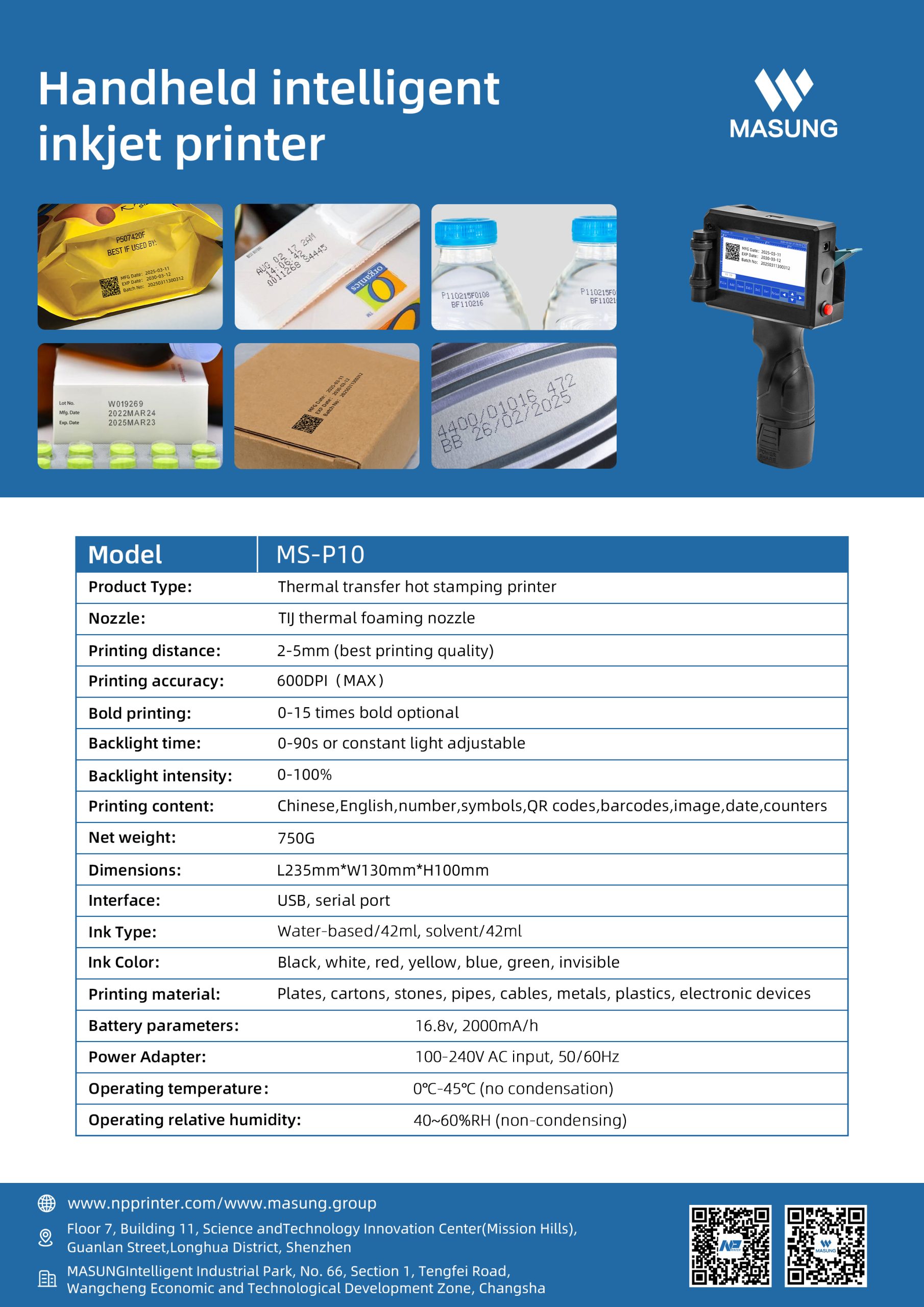 The MS-CHP10 handheld intelligent inkjet printer can be used across a wide range of industries for marking, coding, and labeling products and materials, including manufacturing, packaging, food and beverage, bakeries, pharmaceuticals, construction, logistics, and textiles.